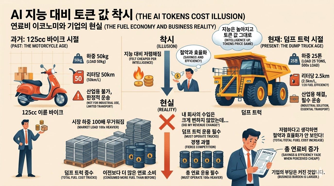 연료 자체가 산술적으로 저렴해지고 효율이 좋아져도, 생태계 전체를 구성하는 ‘연료비의 이코노미’에서 기업의 부담은 커진 것입니다. 이것이 AI 기능을 도입해야하는 수많은 기업들의 현실입니다.